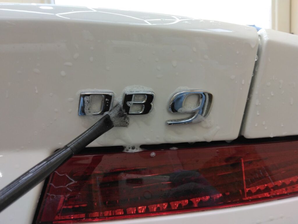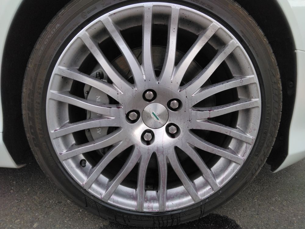 迫力のV12エンジン搭載DB9のコーティング依頼をいただきました。はじめに足回り、ボディ洗浄、鉄粉除去、水垢落としを行なっていきます。